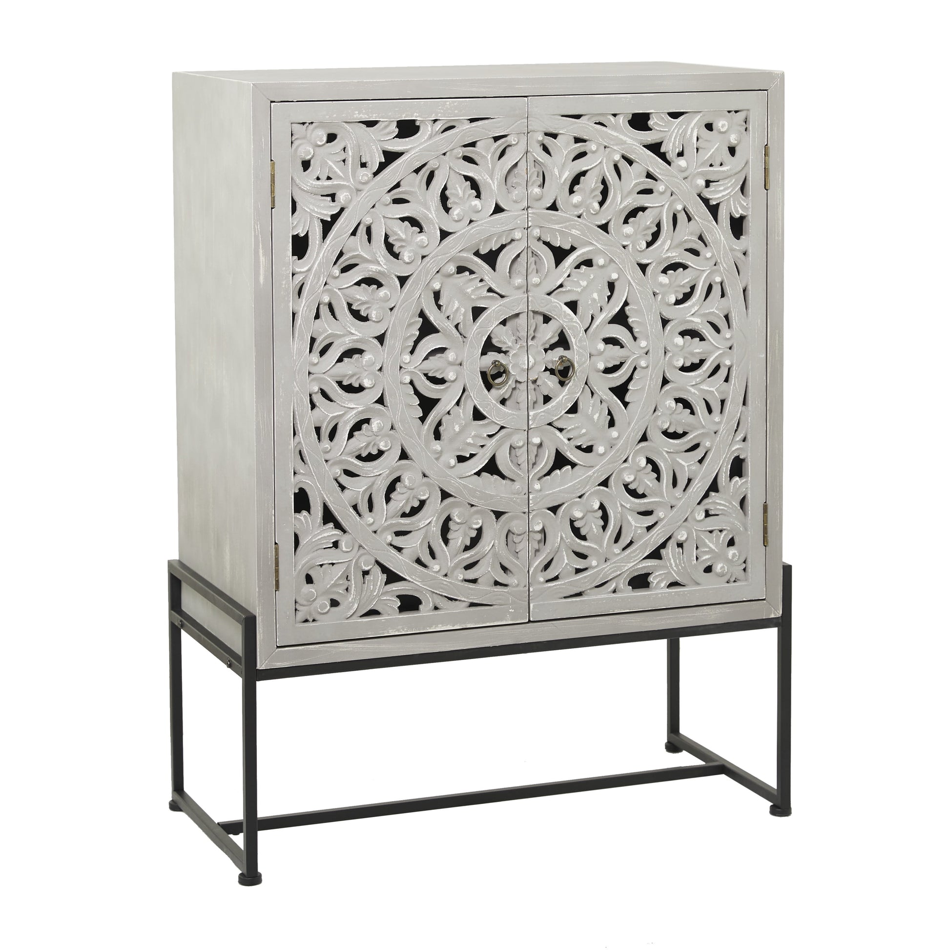 - Tall storage unit features an extraordinary mandala carvings on each cabinet doors with magnets closure for secure display, and supported by rectangular base frame